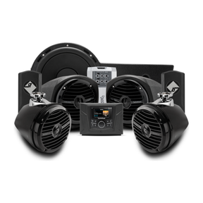 The Stage 4 kit is the complete package that combines the Stage 3 kit with our rear speaker option. Adding our RM1 series mini speaker enclosure and clamp system, this kit adds the last bit of sound that you need. Simply plug in the harness, mount the speakers and rock out. Whether hitting the dunes or the trails, you are sure to be the center of attention of any get-together.